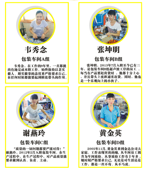 8月4日, 2016年度廣東金達勞動標兵完滿落幕。該活動自7月初以來,歷時了1個月時間,經(jīng)過前期激烈的投票評選,金達公司堅持公開、公平、公正的評選原則,建立管理層評選團評審,實行員工代表無記名投票方式;經(jīng)過激烈的投票評選,最終廣東金達“2016年度勞動標兵”名單火熱出爐: